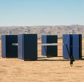 "OutOut Houses is an installation consisting of 4 small rooms. The rooms are freestanding but connected by 10-foot long steel square tubes. Each room has a 14-inch wind turbine on its roof. As wind blows, the turbine blades spin and rub against a metal and rubber armature to produce a rhythmic sound. The turbines have been modified by the removal of specific blades, creating a different interval for each room. The number of blades per turbine is 21, 20, 18 and 16. From inside each room, a person can listen to the sound emitted from the turbine above, as well as hear sound from the connected rooms in an overlapping sequence. The following recordings were made in Joshua Tree on October 16, 2011 at High Desert Test Sites." (label info)