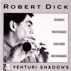 "It would be easy to argue that Robert Dick is the most important living 20th century flutist. He might bridle at being called avant garde (and then again, he might not), but his explorations of extended flute technique have helped do for his instrument what Bertram Turetsky did for the string bass and John Cage for the piano -- opened up a new realm of tonal possibilities that had either never occurred to those before him, or which had never been extended quite as far as they could have been. Harmonic vocalization and the percussive smacking of keys, for example, are not new techniques, but they sound brand new in Dick's work. That said, Venturi Shadows is not for the faint of heart - don't go looking for humalong melodies here. "A Black Lake With a Blue Boat on It" features nifty backwards sampling courtesy of computer whiz Neil Rolnick, while "Further Down" showcases Dick's astounding tonal palette; his use of vocalisms and his ability to coax an enormous range of timbres from his flute will make you reassess the limitations of acoustic instruments. "Bassbamboo" is a charming piece in which Dick plays a percussion part on his bass flute while Steve Gorn (his frequent collaborator) traces an oriental melody around it on the bamboo bansuri. Much of the music on this disc is rather severe, but it's all rewarding." (label info)